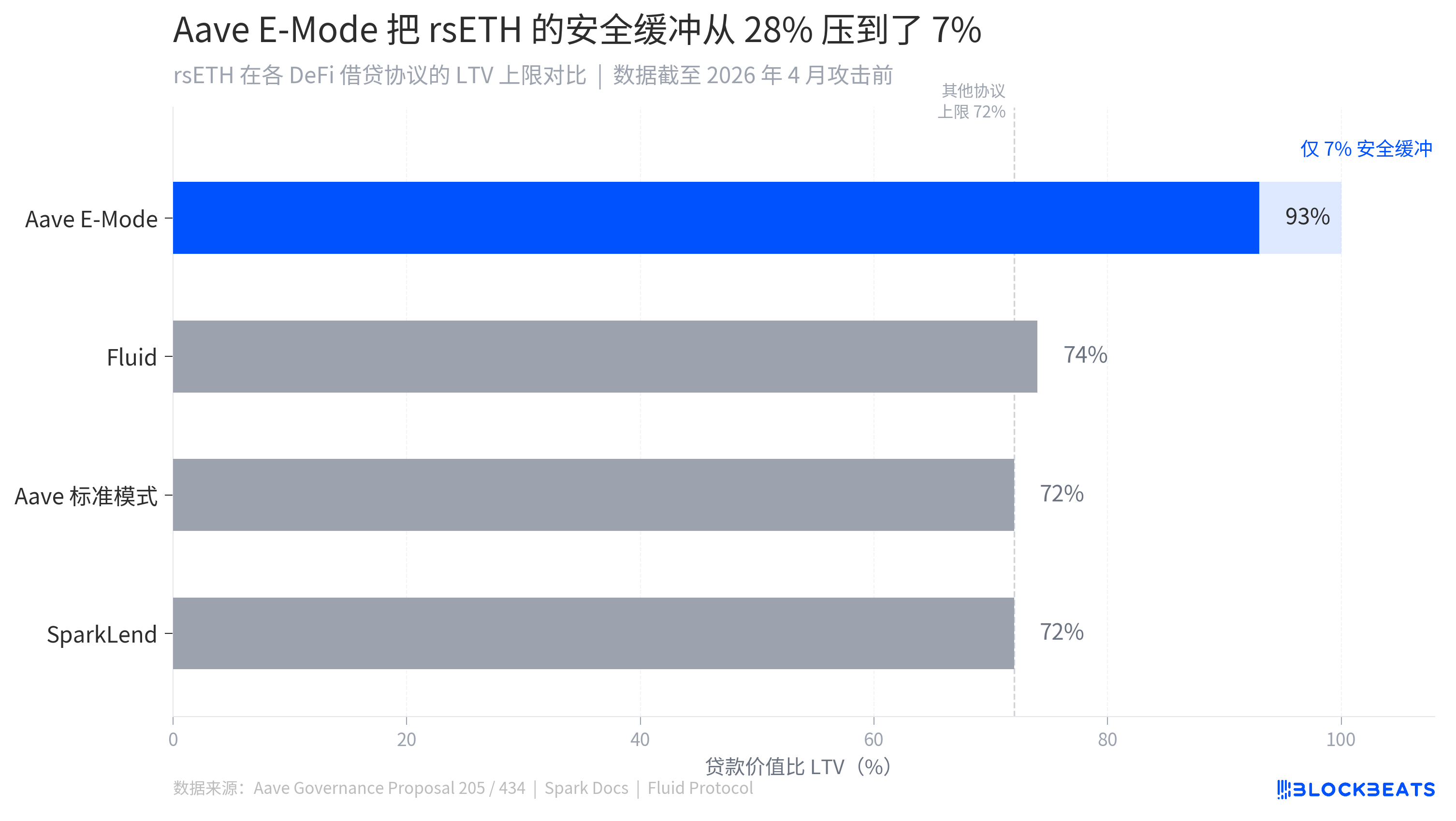 Hai giao protokô khác với rsETH đã đưa ra câu trả lời khác nhau, SparkLend đặt LTV cho rsETH là 72%, giao protokô Fluid sử dụng tỷ lệ tín dụng tối thiểu cố định tương đương với khoảng 75% LTV. Cả hai giao protokô đã hoàn thành việc đóng băng thị trường rsETH trong vài giờ sau khi xảy ra cuộc tấn công. Con số của Aave là 93%. 21 điểm phần trăm còn lại, đổi lấy là sự cạnh tranh mạnh mẽ.
