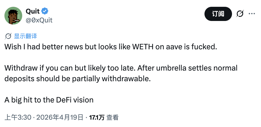「Tôi hy vọng mình mang lại tin tức tốt hơn, nhưng WETH trên Aave dường như đã hỏng. Nếu có thể, hãy rút tiền, nhưng có lẽ đã quá muộn. Sau khi Umbrella giải quyết, tiền gửi bình thường có thể được rút một phần. Điều này là một cú sốc lớn đối với tầm nhìn DeFi.」