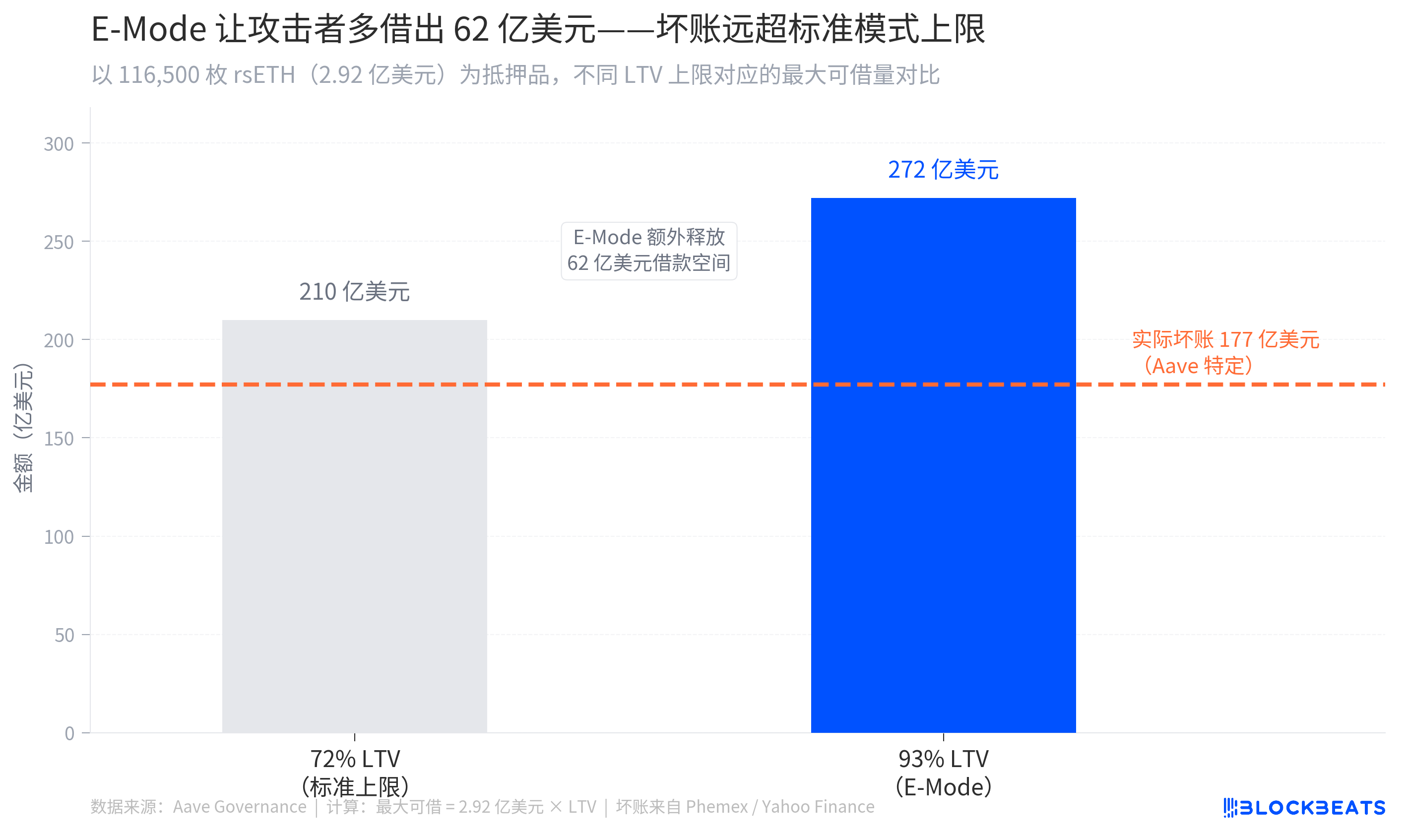 Ước tính quy mô các khoản xấu khoảng từ 177 triệu đến 200 triệu USD (theo nhiều nguồn như Phemex, Yahoo Finance, v.v.), tổng giá trị của các vị thế cho vay mà kẻ tấn công đã mở lớn hơn 236 triệu USD (theo CryptoBriefing). Với việc sử dụng 116,500 đồng rsETH làm tài sản thế chấp, dưới sự giữ tỷ lệ giá trị thế chấp (LTV) E-Mode 93%, có thể mượn tối đa khoảng 272 triệu USD WETH, vượt qua giới hạn của LTV tiêu chuẩn 72% khoảng 62 triệu USD, E-Mode đã nén độ an toàn từ 28% xuống còn 7%, bất kỳ biến động giá nhẹ nào cũng đủ khiến vị thế mất kiểm soát.