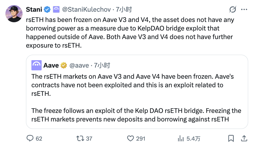 Khi bài viết này được đăng, người sáng lập Aave Stani Kulechov vừa đăng một tuyên bố khác trên cùng một nền tảng: rsETH đã bị đóng băng, hợp đồng thông minh của Aave 「không bị tổn thương」, vấn đề xuất phát từ phía Kelp DAO. Hai bài viết cuộn dọc song song trên một dòng thời gian duy nhất.