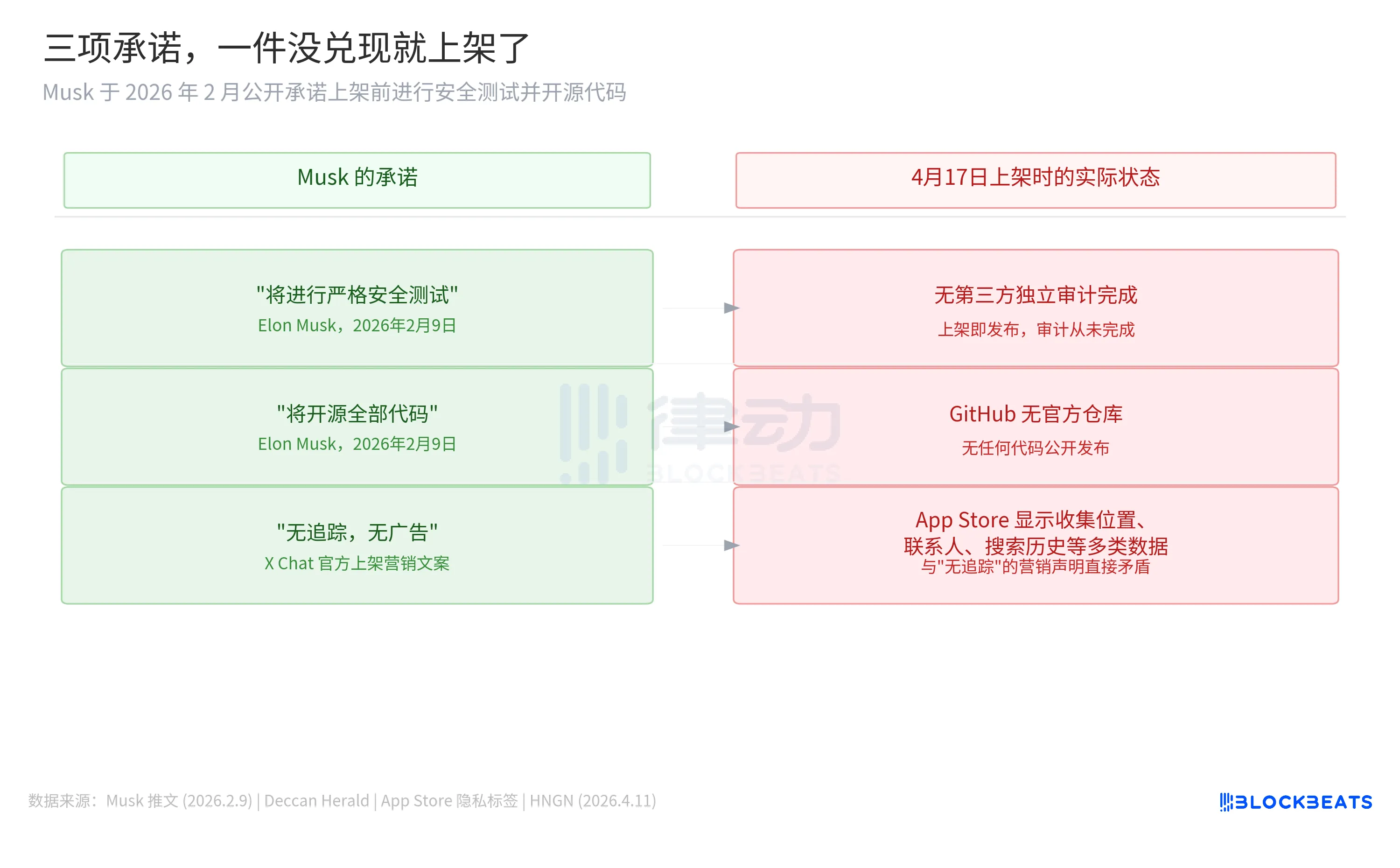 Cho đến khi được phát hành vào ngày 17 tháng 4, chưa có bài kiểm tra độc lập của bên thứ ba hoàn thành, không có kho mã nguồn chính thức trên GitHub, nhãn quyền riêng tư trên App Store cho thấy X Chat thu thập năm loại dữ liệu trở lên bao gồm vị trí, thông tin liên hệ, lịch sử tìm kiếm, mâu thuẫn trực tiếp với tuyên bố tiếp thị khi phát hành là 「Không Quảng Cáo, Không Theo Dõi」.