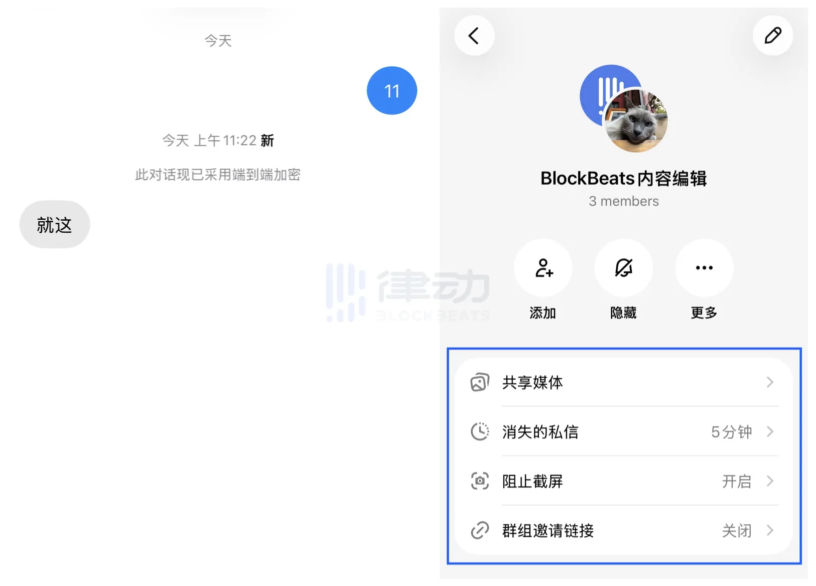 Hủy tin nhắn sau khi đọc (tin nhắn riêng biệt biến mất), chặn chụp màn hình (chặn chụp màn hình) được thiết lập riêng cho từng cuộc trò chuyện hoặc nhóm trò chuyện, không thể điều chỉnh chung trước đó trong trang cài đặt. Khi bắt đầu trò chuyện mới, nội dung trò chuyện sẽ tự động hiển thị đã được mã hóa.
