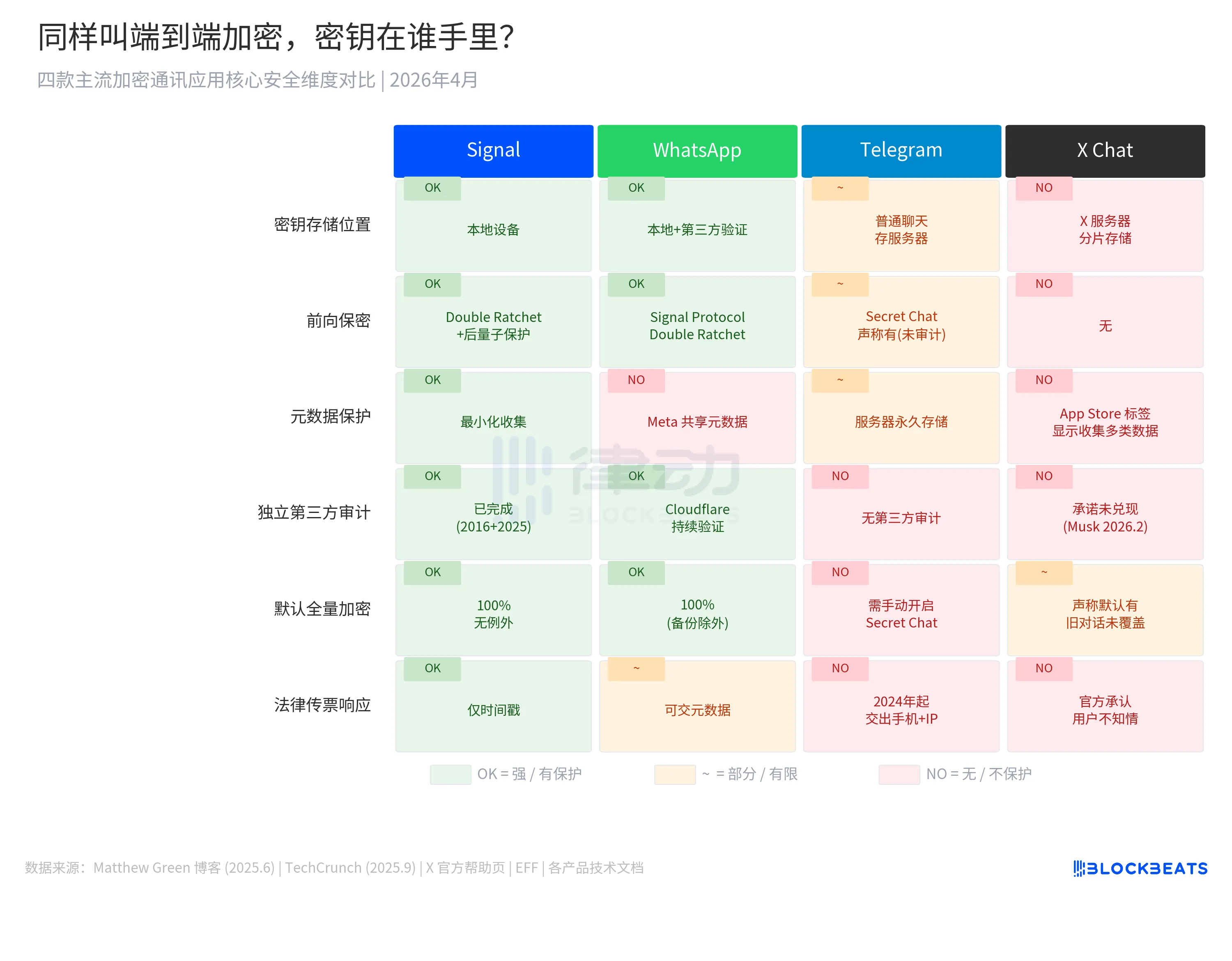 Biểu đồ so sánh cơ chế an ninh theo sáu chiều của Signal, WhatsApp, Telegram và X Chat. X Chat là duy nhất trong bốn ứng dụng này do bên cung cấp nền giữ khóa và cũng là duy nhất không có bảo vệ ngược (Forward Secrecy).